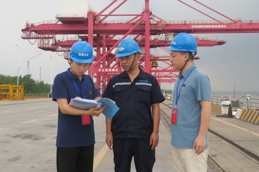 2025年8月,高峰(左一)与同事在城陵矶码头了解情况。