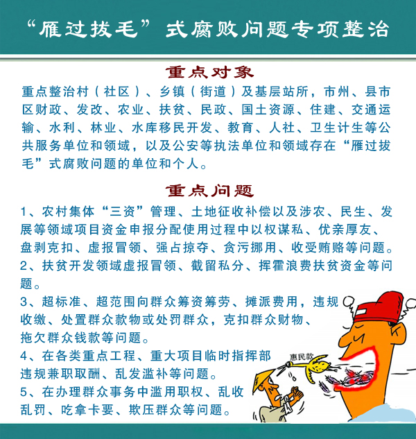 (一)重点人员。财政、发改、农业、扶贫、救济、民政、国土资源、住建、交通运输、水利、林业、移民开发、教育、人社、卫生计生等公共服务单位和领域,以及公安等执法单位和领域存在“雁过拔毛”式腐败问题的单位和个人。
