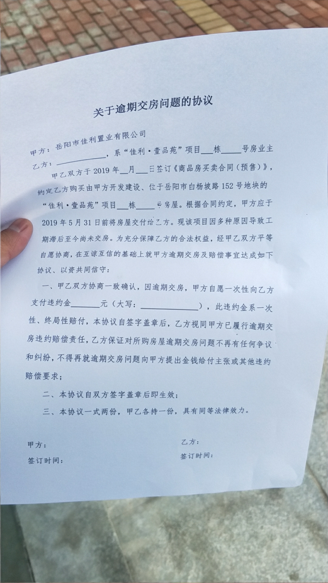 LS: 我于2017年11月份购置佳利·壹品苑商品房并签订购房合同,合同约定2019年5月31日交房,并约定如逾期交房,则每天赔偿房屋总价的万分之一违约金。2019年12月1日,我收到壹品苑开发商寄过来的收房通知单,告知12月2日-8日办理收房手续,12月2日来营销中心对接,咨询逾期交房赔偿问题。开发商直接口头告知,逾期交房不是他们的问题,是政府导致的,现在只能按80天逾期赔偿,如果接受,则签字确认收房;如果不服,可以通过法院处理,我们接受法院判处结果。于是,交房不欢而散。 对此,我有如下几个问题请求政府相关部门处理: 1、交房时间及达标问题:11月30日开发商寄出交房通知单,该楼盘是否已经在11月30日前已经办理了全部的竣工验收资料(取得三书一证一表)达到了收房条件?如果存在提前告知嫌疑,相关职能部门是否有相应行政处罚? 2、交房手续问题:正常交房手续是否有必须接受开发商当前不对等违约赔偿才能办理交房?如不接受,开发商单方面告知逾期默认收房是否合规? 3、逾期交房赔偿问题:合同明确约定5月31日交房,截止到12月1日,逾期已超过180天,开发商一则口头说是政府方面导致逾期,二则只愿意按80天逾期计算。请问这种口出狂言给政府扣帽子的说法,我们只能是接受或者通过法院处理吗?对于这种毫无信誉的开发商,相关主管部门是否可以直接用行政手段要求按合同处理? 附件1:222.jpg 附件2:333.jpg 附件3:444.jpg 附件4:555.jpg |